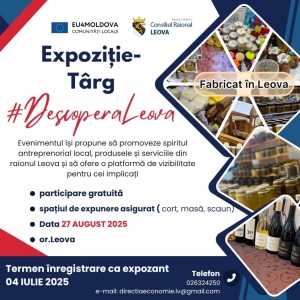 Consiliul raional Leova anunță concurs de oferte pentru selectarea unei companiei care va efectua și va livra materiale promoționale, pentru activitățile din cadrul proiectului „Fortificarea capacităților agenților publici și privați în dezvoltarea economică locală prin valorificarea patrimoniului turistic și cultural al raionului Leova” implementat în cadrul programului „EU4Moldova: Comunități Locale” Citeşte mai mult...