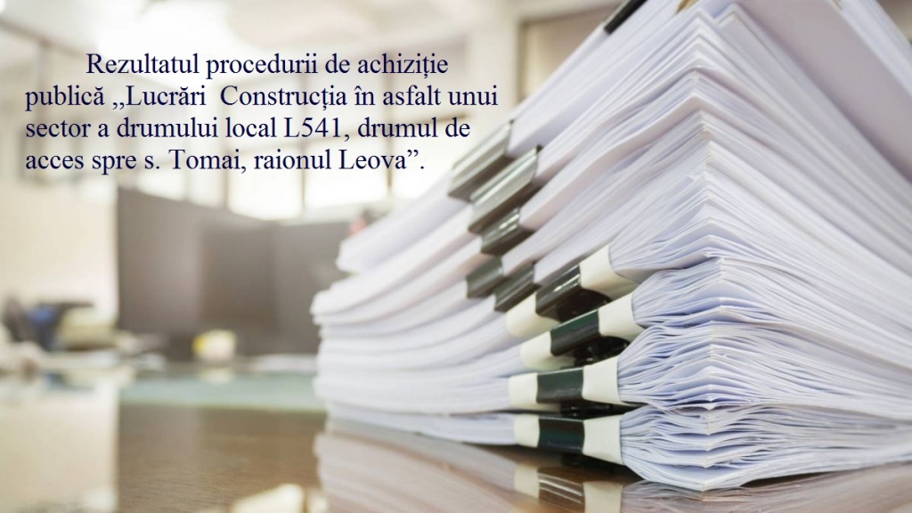 Consiliul Raional Leova a desfășurat la data de 06.05.2021 ora 11:30 procedura de achiziție publice ”Lucrări Construcția în asfalt unui sector a drumului local L541, drumul de acces spre s. Tomai, raionul Leova”. Învingătorul este ”VICOLIV GRUP” SRL.